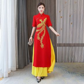 红色旗袍女长款高贵年轻款改良版连衣裙走秀演出妈妈修...