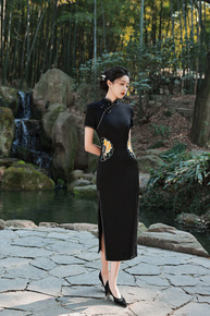 旗袍2022年新款年轻款旗袍气质优雅黑色长款改良连...