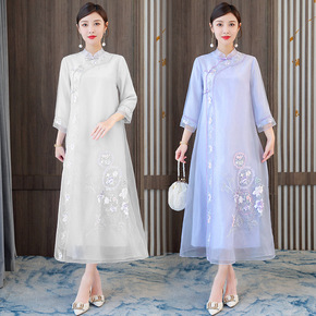 依芙妮2022春装新款中式复古欧根纱茶服刺绣改良旗...
