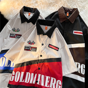 夏季新款短袖衬衫刺绣撞色美式机车情侣棒球服青春潮男...