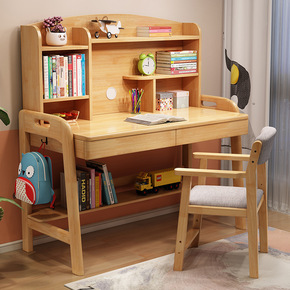 儿童学习桌可升降女孩实木书桌书架一体家用中小学生写...