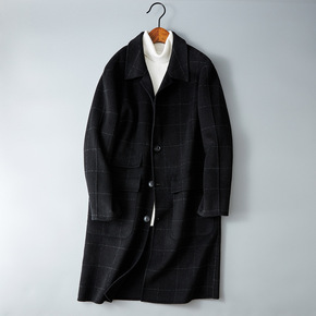 双面呢大衣男秋冬新款中长款羊毛呢子外套青年韩版格子...