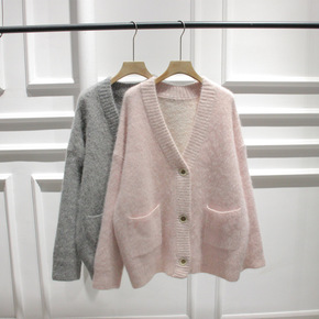 韩国ins早秋慵懒风V领百搭宽松休闲纯色灯笼袖针织...