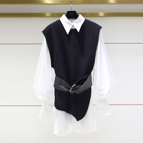 2021冬装新款长袖衬衫翻领腰带马甲针织衫两件套女...