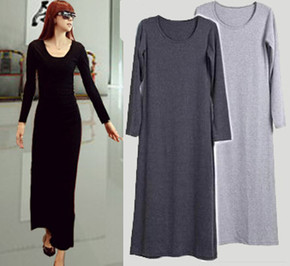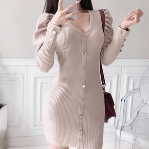 秋冬装新款气质下摆开衩V领内搭针织连衣裙中长款收腰...