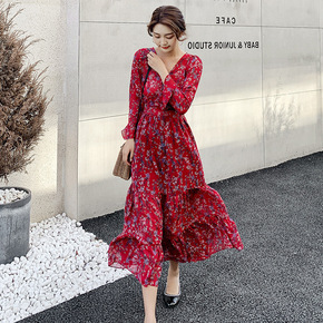 碎花V领连衣长裙流行过膝春秋冬装新款长裙袖收腰显瘦...