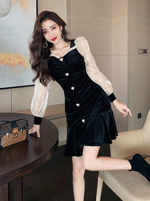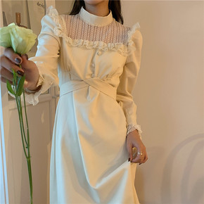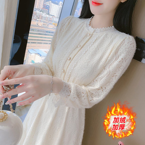 加绒蕾丝打底连衣裙子女装秋冬装2021年新款高级感...