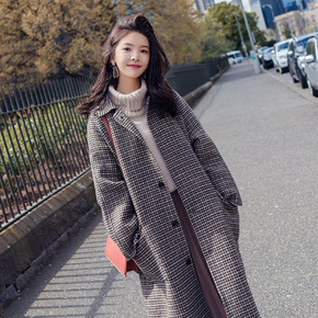 夹棉长款棉衣女2021冬季复古翻领格子拼色单排扣保...