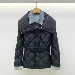 2021秋冬季新款女装开衫收腰韩版水洗牛仔拼接羽绒...