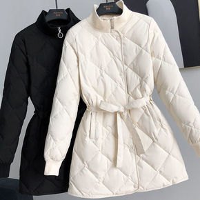 2021冬季新款立领菱格系带收腰显瘦保暖中长款羽绒...