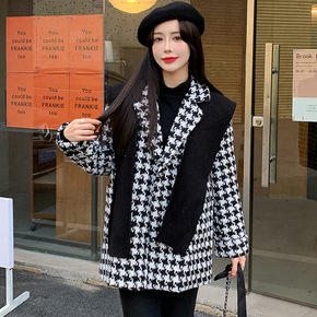 实拍实价新款韩版千鸟格子加棉气质感修身呢子西装大衣...