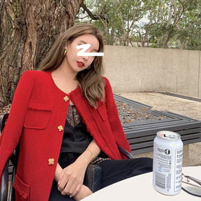 法式名媛风红色毛呢外套女秋季短款百搭显瘦洋气金属纽...