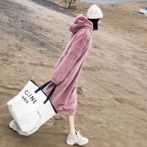 毛绒绒卫衣女2019秋冬中长款过膝宽松连帽套头毛茸...