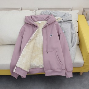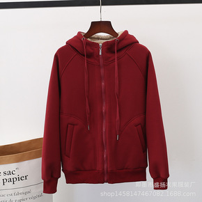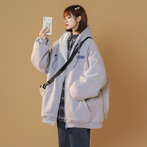 加绒加厚卫衣女秋冬新款宽松大码拉链保暖上衣羊羔绒连...