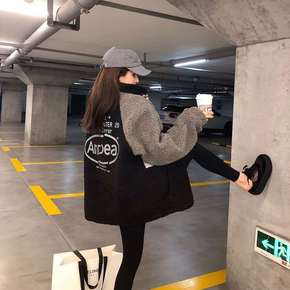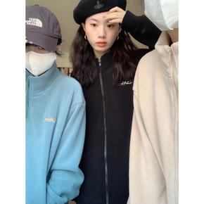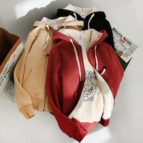 加绒加厚羊羔绒卫衣女立领拼色显瘦学生拉链秋冬宽松上...