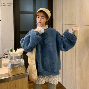 加绒加厚卫衣女秋冬羊羔绒羊羔毛圆领灰色2021新款...