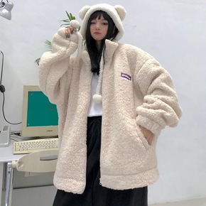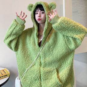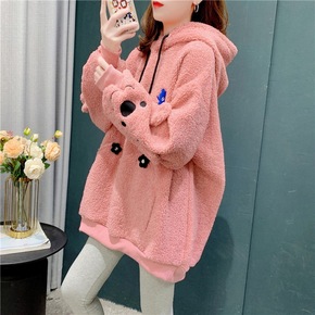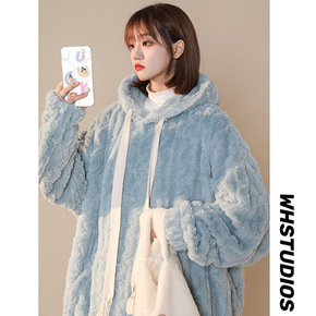 秋冬新款连帽长毛绒卫衣女加绒加厚宽松冬季外套开衫拉...