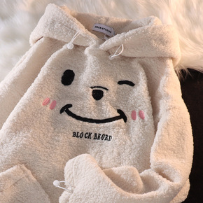 新款盐系复古小熊笑脸羊羔绒连帽卫衣男女ins国潮情...