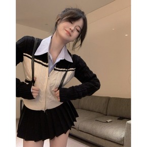 早秋蓝色衬衫长袖短款衬衣+棉衣外套开衫拉链长袖针织...