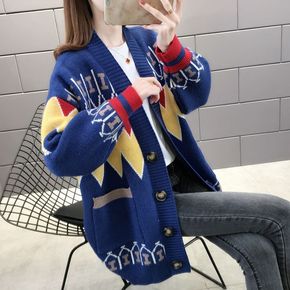 长款开衫外套女2022秋冬新款韩版宽松学生针织衫蓝...