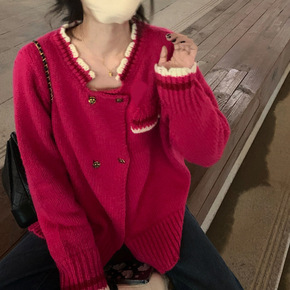 莓莓派撞色花边玫瑰扣冬季针织开衫马海毛加厚玫红毛衣...