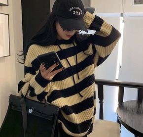 冬季加厚含羊毛连帽条纹毛衣女中长款宽松慵懒针织衫外...