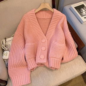 粉色毛衣外套女冬季加厚2021年新款v领甜美可爱洋...