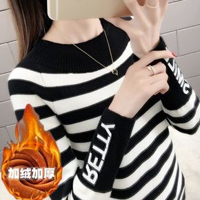 加绒加厚毛衣女秋冬2021新款洋气韩版修身条纹拼色...