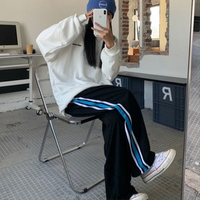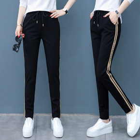 条纹束脚魔术贴高街裤子女春秋港风显瘦休闲卫裤宽松百...