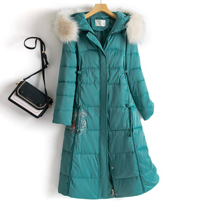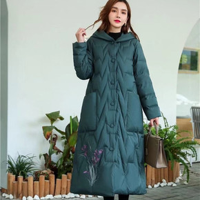 秋冬中国风白鸭绒刺绣中长款气质宽松中长羽绒服女批发...