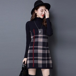 2020秋冬新款女装长袖格子毛衣裙韩版中长款半高领...