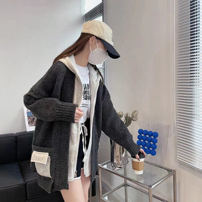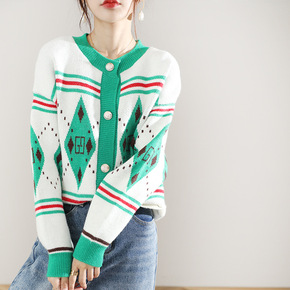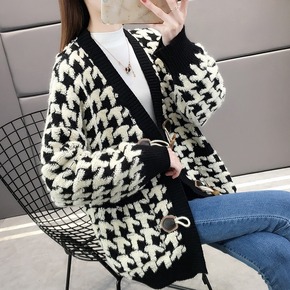 秋季慵懒风毛衣开衫女外套2021新款宽松加厚千鸟格...