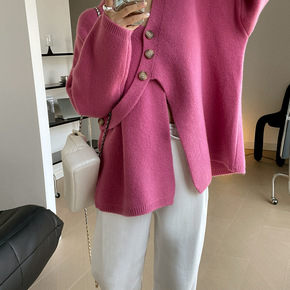 韩国东大门设计感斜扣绑带毛衣开衫慵懒风复古V领针织...