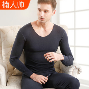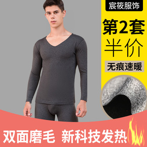 男保暖内衣双面磨毛修身V领秋衣秋裤套装打底衫加绒加...