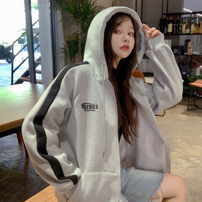 F7868实拍 拉链卫衣女加绒加厚口袋字母刺绣开衫...