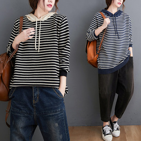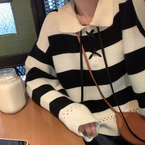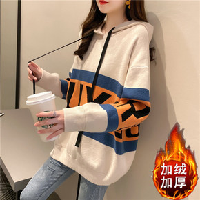 实拍现货2020年秋冬新韩版宽松长袖条纹连帽针织衫...