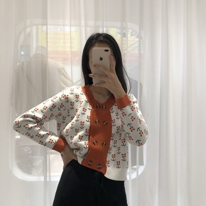 早秋女装双排扣针织衫复古提花短款厚款毛衣撞色时尚假...