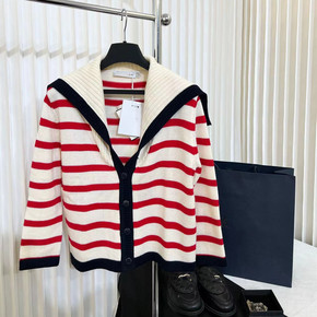 22春秋D针织衫女学院风海军水手服翻领条纹长袖开衫...