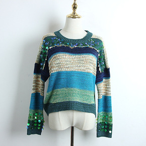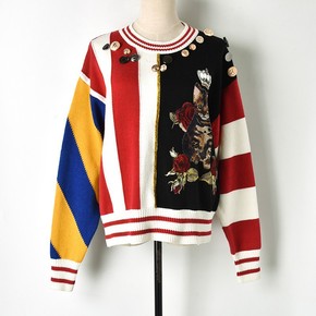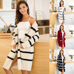 2020秋冬新款速卖通亚马逊欧美中长款条纹拼色针织...