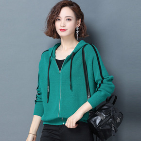 洋气针织卫衣带帽拉链开衫2020秋装时尚女士宽松条...