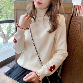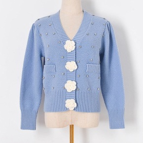 秋冬新款V领钉钻手勾立体花朵扣长袖针织毛衣开衫女式...