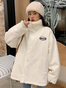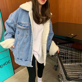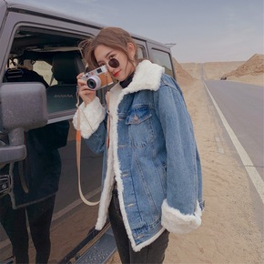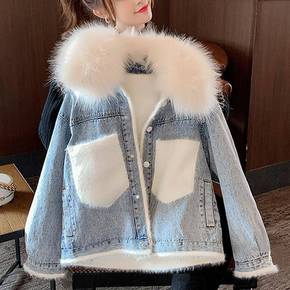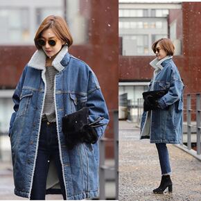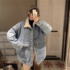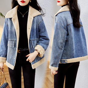 2022秋冬新款欧美女装加绒牛仔外套加厚中长款羊羔...