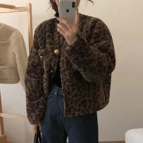 羊羔毛豹纹外套女2022冬装新品短款小个子流行上衣...