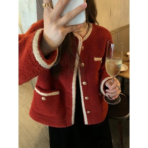 红色小香风羊羔毛绒外套女设计感小众上衣2022年秋...