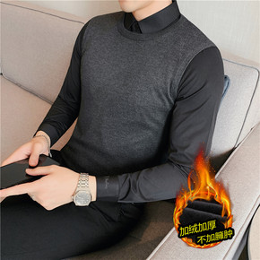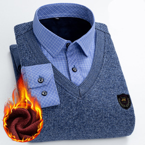 秋冬装男士假两件保暖衬衣爸爸装假两件套头针织加绒加...