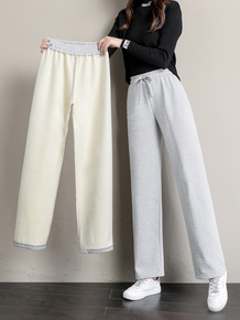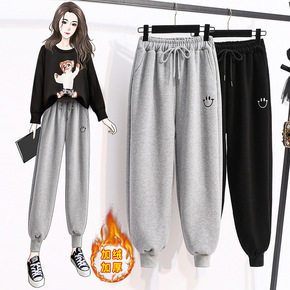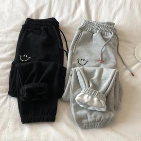 柔软。黑/灰秋冬宽松显瘦加绒加厚笑脸刺绣运动裤女束...