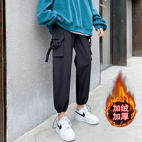加绒工装裤女秋冬季高腰显瘦2020新款加厚宽松束脚...