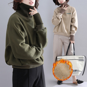 实拍2020秋冬韩版慵懒风复古宽松套头加绒拼接高领...
