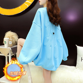 大码女装2022新款秋冬蓝色小熊凹凸印卫衣女加绒加...