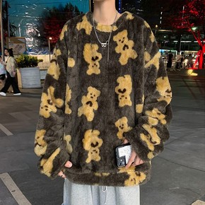 2021秋冬季加绒卡通趣味小熊卫衣男宽松圆领长袖羊...